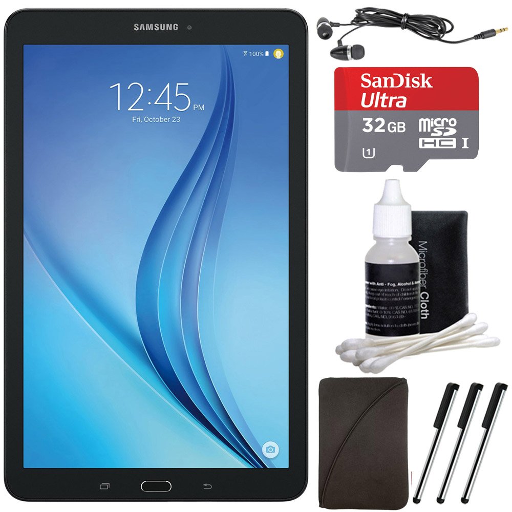 Samsung Galaxy Tab E 9.6" 16GB Tablet PC (Wi-Fi) - Black 32GB microSD Card Bundle includes Tablet, Memory Card, Cleaning Kit, 3 Stylus Pens, Metal Ear Buds and Protective Sleeve