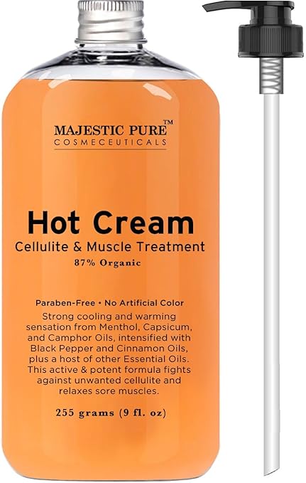 - Majestic Pure Hot Cream; 100% natural; contains 87% organic content; no harmful chemicals; cruelty free; reduces the appearance of cellulite; muscle pain relief cream; made in USA